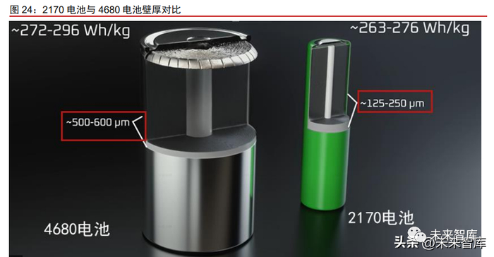4680 电池结构件相比 2170 电池结构件,壁厚由 0.2mm 增加至 0.6mm。根据 Limiting Factor 对于特斯拉 4680 电池的拆解数据,4680 电池的壁厚在 0.5-0.6mm,相比 2170 电 池的壁厚 0.125-0.25mm 明显增加。我们预计是结构化电池下,对于电芯壳体的结构强度 要求更高,因此壁厚增加。