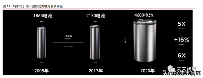 从 1865 到 2170 再到 4680,特斯拉又一次引领圆柱动力电池升级,4680 电池未来 有望成为下一代圆柱动力电池标准型号。圆柱动力电池此前经历过一次升级,在早期的 Model S/X 和第一批 Model 3 中,特斯拉采用的是松下的 1865 电池;随后在 2017 年,特 斯拉与松下联合研发的 2170 电池开始量产,2170 电池相比 1865 电池能量密度更高、成 本更低,随后陆续搭载于特斯拉旗下车型,完成了圆柱动力电池从 1865 到 2170 的升级换 代。此次 4680 电池的提出,是特斯拉引领下的又一次圆柱动力电池升级,未来 4680 有望 替代 2170 电池成为新一代圆柱动力电池标品。