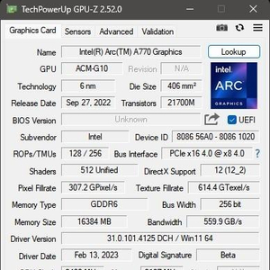 锐炫A770显卡包含32个Xe-core,XMX引擎512个,渲染切片数量8个,光追单元32个,频率2100MHz,16GB GDDR6@17.5Gbps显存,显存带宽560GB/s,总线位宽均为256bit。