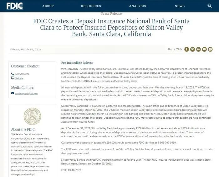 美国联邦存款保险公司(FDIC)发布公告称,美国硅谷银行10日被美国加利福尼亚州金融保护和创新部关闭,并指定美国联邦存款保险公司为接管方。
