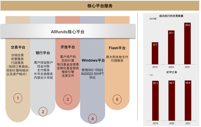 ►另一方面,公司通过打造自动化核心平台服务,提高客户服务效率。Allfunds通过交易平台、银行平台、开放平台、Windows平台和Flash平台提供各项基金分销服务,并将上述子平台组合为单一的综合性平台。公司致力于实现交易流程全自动化操作、无需人工干预("直通式处理(STP)环境"),2021年STP率不断优化至95.8%,从而最大限度地降低运营成本,提高分销效率。