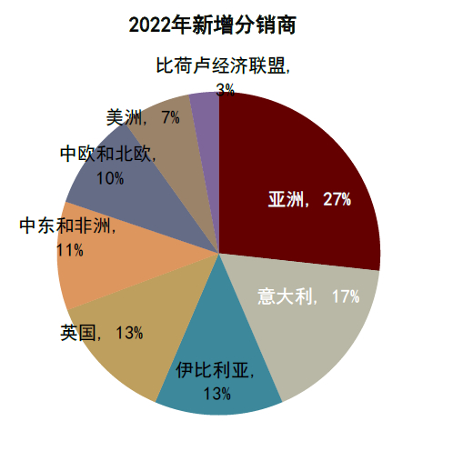 图表12:2022年新增分销商中美洲、亚洲、中东和非洲地区客户占比合计45%