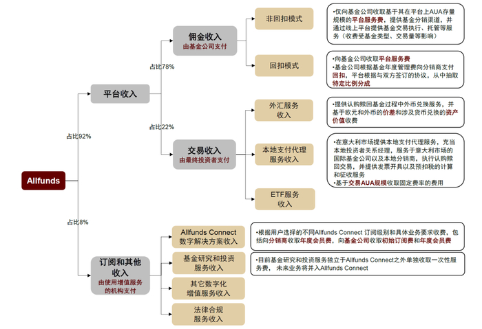►核心平台服务:平台收入近年来持续贡献公司九成以上收入,包括佣金收入和交易收入,2022年占平台收入的比例分别为78%、22%。1)佣金收入:包括回扣模式和非回扣模式两种收费方式,其中非回扣模式下Allfunds仅向基金公司收取基于其在平台上分销的AUA存量规模和一定费率的佣金收入,回扣模式下还会从基金公司给分销商的分成中按一定比例进行抽成,MiFID II监管要求下回扣模式占比逐渐下降,Allfunds平台上非回扣模式资产规模占比由2018年的75%提升至2020年的82%。2)交易收入:提供外汇服务、本地支付代理服务、ETF服务,并基于交易额向终端投资者收取相应费用。其中外汇服务收入主要为Allfunds为进行UCITS基金交易的双方提供欧元与外币的兑换服务,并基于涉及货币兑换的交易额和货币价差收费;本地支付代理服务收入为公司凭借银行牌照、在意大利市场提供本地支付代理[1]LPA服务,即为意大利本地投资者认购外国基金的支付环节提供中介服务、并提供发票开具以及预扣税的计算和征收服务,基于交易额收取固定费率的费用。