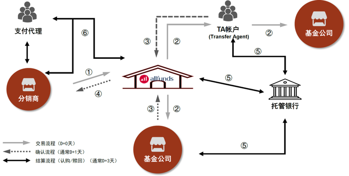 ► 为分销商提供:1)基金分销服务:Allfunds交易平台提供基金交易执行、托管、结算等服务,辅以交易前开户、交易申请确认、份额清算等服务,降低合规风险和交易复杂性;2)分销支持服务:提供实时订单路由查询、每日回扣和费用计算、每日现金账户流量确认和自动生成报告在内的交易后服务,使得分销商提高基金购买效率的同时、充分节约运营成本。