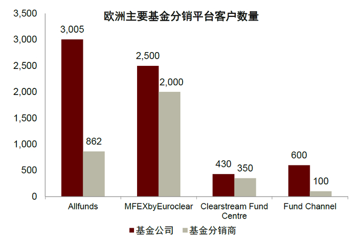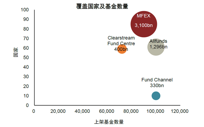 注:1)欧洲两大结算和托管机构Clearstream和Euroclear分别于2020年、2021年通过收购成熟的分销平台切入市场,其中MFEX被Euroclear收购后,AUA由3,200亿欧元大幅提升至3.1万亿欧元,一跃成为业内管理规模最大的B2B基金分销平台;2)Allfunds数据为2022年数据,其余公司为官网披露当前最新数据
