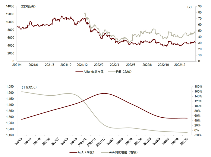 图表10:2022年以来公司AUA增速放缓,估值中枢有所下移;当前交易于44x P/E(TTM),总市值46亿欧元(截至23/03/08)