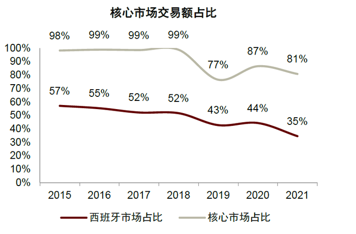 注:1)核心市场包括西班牙、意大利、英国、卢森堡;2)公司尚未披露2022年交易额数据