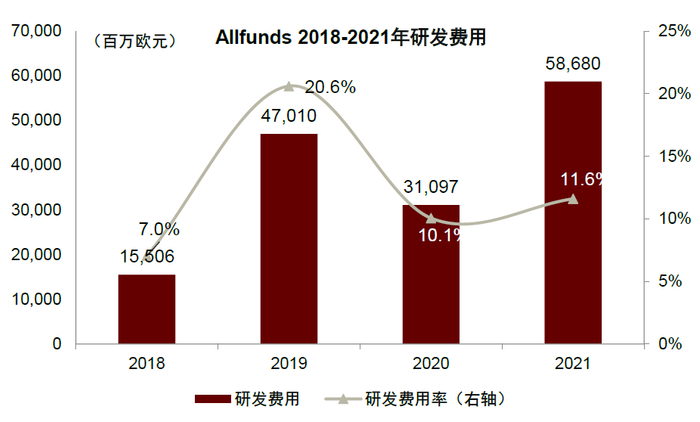 AUA内生增长动力强劲。Allfunds平台基金分销保有量(AUA)增长来自于客户资产净流入、现有存量资产增值、以及并购整合;剔除并购带来的影响,2018-2021年AUA复合增速达45%,其中2021年客户资产内生增长率[2]为13%,彰显强劲的内生增长动能。