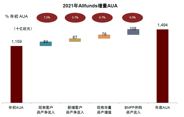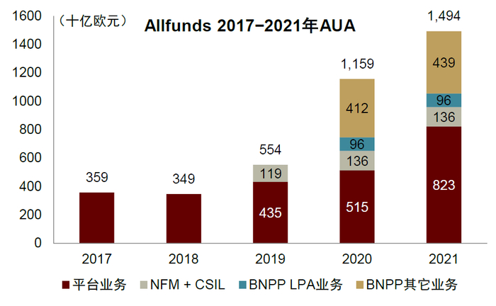 注:1)内部模式指基金公司直接通过签订双边协议和分销商进行基金分销交易;2)BNPP客户转移指与BNPP战略合作后其客户资产转移至Allfunds;