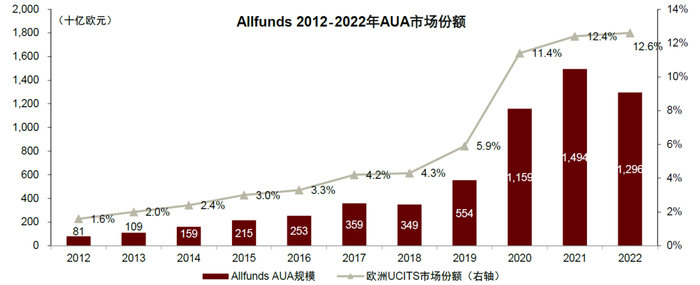 图表1:2022年末Allfunds客户资产规模达1.3万亿欧元,在欧洲UCITS市场的市场份额达13%