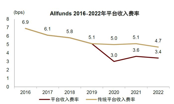 平台收入费率具有较强韧性。平台收入费率[3]由2017年的6.9bps下降至2022年的3.4bps,剔除费率水平较低的BNPP其它业务后,传统平台收入费率由2017年的6.1bps下降至2022年的4.7bps,费率下降的原因包括:1)佣金收入收费模式的转变:即Allfunds从基金公司给分销商回扣中的抽成收入逐年减少,是导致平台收入费率下降的主要原因;2)对新增客户的优惠定价:公司在扩展新市场(如亚洲)或特定战略客户时,为引流而提供较为优惠的定价;3)对现有客户按AUA规模的差异定价:当现有客户不断增加其在平台上的AUA存量规模时,将按照更低的费率标准进行收费。往前看,我们认为佣金收入的收费模式转变已基本完成,且公司作为头部B2B一站式基金分销平台、凭借较强渠道优势或享有一定议价能力。