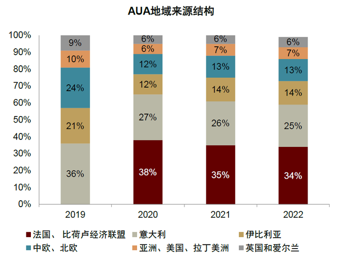 Allfunds成立二十余年,专注为基金公司和分销商提供基金分销服务,通过全球扩张与外延并购不断扩大分销商网络,打造全球基金分销生态圈。1)2000−2007年:Allfunds欧洲本土基金分销业务起步,相继进入西班牙、意大利、英国、卢森堡市场,2021年上述四个市场的交易额占公司总交易额的81%。2)2008年至今:Allfunds通过设立当地办事处、以及并购整合,打造以欧洲为核心,延伸至美洲、亚洲、非洲的全球基金分销生态圈,2022年末来自亚洲、美洲地区的AUA规模贡献达7%,2022年公司新增分销商中来自美洲、亚洲、中东和非洲地区的客户占比合计超45%,我们认为有望为公司未来业绩增长提供新的动能。