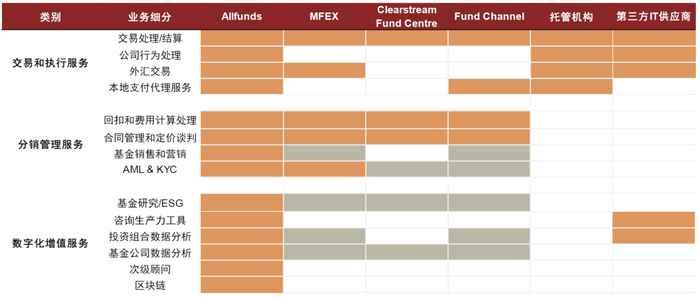 注:1)公司行为处理Corporate actions processing提供包括通过Allfunds工作站、电子邮件或SWIFT向客户分发企业官方活动文件(如年度股东大会和一般变更通知),详细介绍每个事件的关键信息摘要等服务;2)橙色为提供深度服务,灰色为提供基础服务