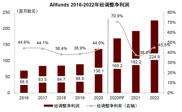 Allfunds成立于2000年,为基金公司和分销商提供基金交易、托管、结算以及包含数据分析、投资组合工具等数字化增值服务在内的一站式基金分销服务。截至2022年末,公司平台上线了来自3,005家基金公司的约10万只基金,合作的基金公司数量业内领先;同时服务于全球61个国家的862家分销商,包括银行、保险公司、养老基金和独立财务顾问等。2021年Allfunds平台累计进行了超2,960万笔基金交易,2022年实现营业收入4.9亿欧元(2018−2022年CAGR 22%)、调整后净利润2.2亿欧元(2018−2022年CAGR 28%),当前市值46亿欧元(截至23/03/08)。2022年末公司客户资产规模达1.3万亿欧元(2018−2022年CAGR 39%),在欧洲UCITS市场的市占率达13%,是全球规模第二大的B2B基金分销平台。