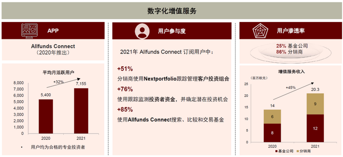 ► 一方面,公司通过提供数字化增值服务,提高客户服务能力。公司推出Allfunds Connect为客户提供基金方案、数据&分析、财富管理方案、合规服务四项数字化增值业务。具体来看:1)基金方案:获取广泛的基金信息库,通过超20个筛选条件实时搜索、跟踪和比较分析超20万只基金;2)数据&分析:整合大量基金销售数据,分国家、资产类别和分销渠道分析每日流量和市场表现,并提供对基金公司和分销商的业绩报告工具;3)财富管理方案:为客户提供工具构建并管理投资组合,应用算法模型提供面定制化投资组合建议,全面披露并集中监控客户资产配置情况并自动生成报告;4)合规服务:提供更加高效的尽职调查服务。截至2021年末,约86%的平台分销商和约25%签订了全球分销协议的基金公司订阅了Allfunds Connect,合计贡献了约0.2亿欧元的增值服务收入。