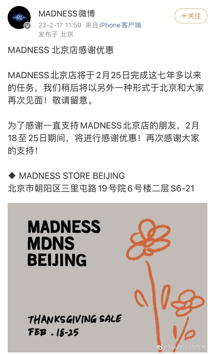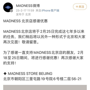 无独有偶,另一个靠明星个人影响力打造的潮牌MADNESS,在2023年2月26日关闭了其在北京三里屯的直营店,这也是余文乐作为主理人的MADNESS在内地唯一一家线下直营店。