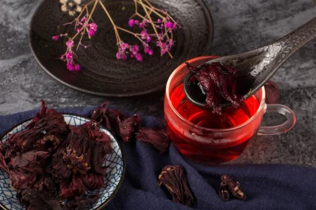 洛神花颜色呈玫瑰红、非常漂亮,冲泡后的水颜色像红宝石一样。洛神花的营养成分非常丰富,主要成分有四类:花青素、多酚酸、有机酸和黄酮等,因此,民间把它叫作“植物红宝石”。
