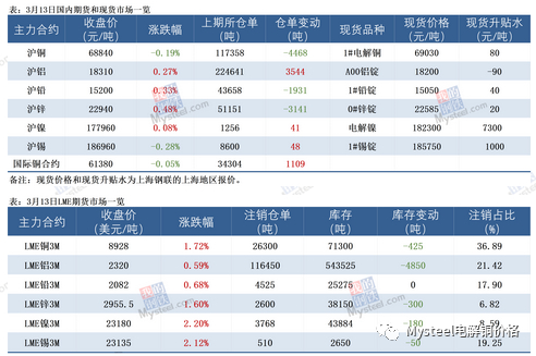 【3月13日LME基本金属库存变化情况】