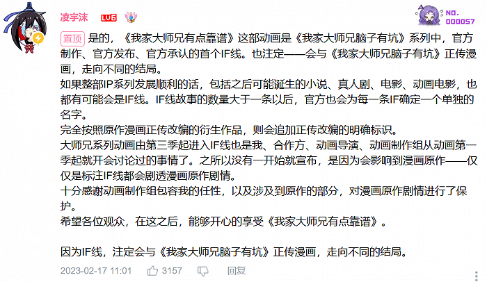这样的设定,注定将为粉丝们留下意难平之处,加上剧情里曾出现“大师兄轮回寻找最优解”的设定,似乎都让如今的官方“IF线”在情理之中。凌宇沫宣布动画为首条IF线时,也透露出值得注意的几点:
