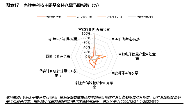 从持仓股票的机构关注度来看,前海开源人工智能、宝盈科技30的持仓在科技主题基金经理中关注度明显更高,而景顺长城电子信息产业主要以挖掘早中期新兴产业标的为主,持仓在科技主题基金经理中关注度偏低,易方达信息产业在高质量标的的核心持仓之外,也在中小市值股票中挖掘个股,持仓黑马股指数自2021下半年以来明显下降。工银瑞信信息产业持仓黑马股指数偏低主要受到行业配置更为均衡分散、非科技板块持仓在科技主题基金经理中关注度偏低的影响。