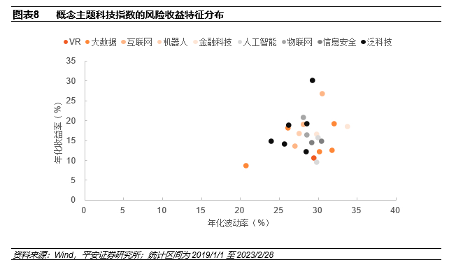 2019年以来工业4.0、工业互联网、物联网等主题指数的年化收益率在25%以上。2019年以来至2023年2月28日,49只概念主题科技指数基金中,跟踪大数据、人工智能主题指数的基金规模最大,规模合计31.9亿元,涉及11只产品;其次为跟踪人工智能主题指数的产品有6只,规模合计31.1亿元。细分指数来看,工业4.0指数年化收益率最高,为30.2%,年化波动率29.2%;其次为工业互联网指数,年化收益率26.7%,年化波动率30.5%。
