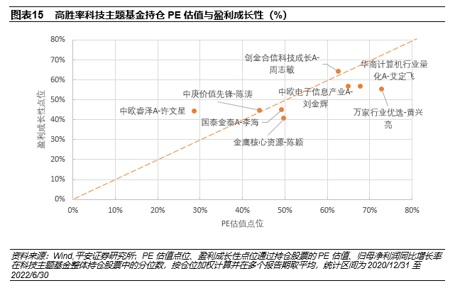从持仓PE估值与盈利成长性来看,中欧睿泽最注重估值保护,中庚价值先锋、国泰金泰持仓估值也相对偏低,偏向低估值的科技成长风格。与之相比,万家行业优选对估值的容忍度较高,在选股时更看重中长期的成长性。华商计算机行业量化为计算机行业量化增强策略基金,在计算机行业重点筛选高成长、高盈利的个股作量化增强,持仓成长性也相对偏高。创金合信科技成长选股看重兼具中长期成长和短期趋势向好的特征,持仓盈利成长性明显更高。