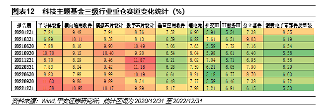 2022年下半年,科技主题基金重点增配半导体设备、软件、模拟芯片设计赛道,以及互联网平台领域,重仓军工电子的基金数量也有所增加。从重仓赛道的变化来看,科技主题基金在2022下半年明显增配半导体设备、横向及垂直软件、模拟芯片设计,并在2022四季度明显增持互联网平台赛道。从重仓赛道基金数量来看,2022年下半年重仓军工电子赛道的科技主题基金数量增加10只左右,平均重仓仓位接近6%。