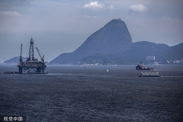 当地时间2020年2月1日,巴西瓜纳巴拉湾,当地海面上的石油钻井平台和储油卸油船只。
