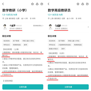 学而思在京沪两地对“数学教研员”岗位的招聘要求包括“研究小学考试命题”