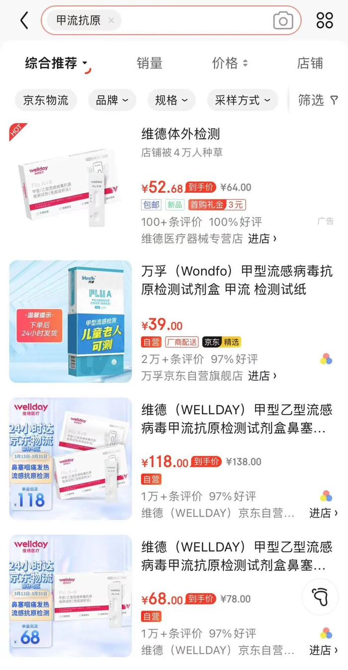 目前,在京东商城上线销售的甲流抗原试剂共有10余款,主要品牌包括万孚生物、硕世生物、维德医疗、亚辉龙等,其中大部分产品可以同时检测甲型流感病毒和乙型流感病毒。