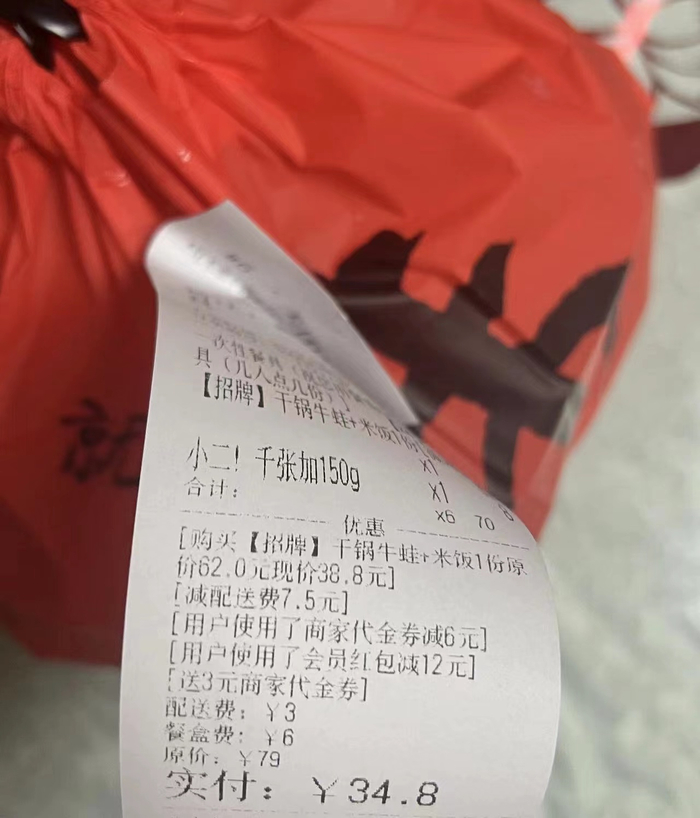 近日,上海消费者王明(化名)对第一财经称,他无意间发现点常点的外卖商家收取了较高的打包费。例如王明购买一份干锅牛蛙套餐,总收费34.8元。外卖包装为一个塑料袋、2个塑料餐盒以及1份一次性餐具,商家共收取6元打包费。王明表示他翻看了之前的订单,发现另一家常点的商家也收取了针对2个塑料餐盒的订单收取了5元的打包费,王明认为上述餐盒费和打包费过高,其他商家通常收取1到2元的餐盒费。