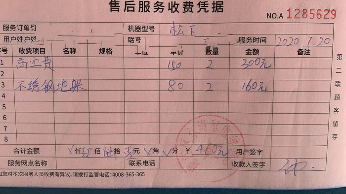 广东消费者伍洲(化名)对第一财经表示,他在两年前的购物节大促中,看到某电商平台销售的松下空调有送“安装补贴”并承诺“乱收费,双倍赔”,虽然单价比其他电商平台高,但考虑附加这些服务后更划算,遂选购了2台。2020年7月20日安装人员上门安装后收取了150元/台的高空费和80元/个的支架费,合计460元。