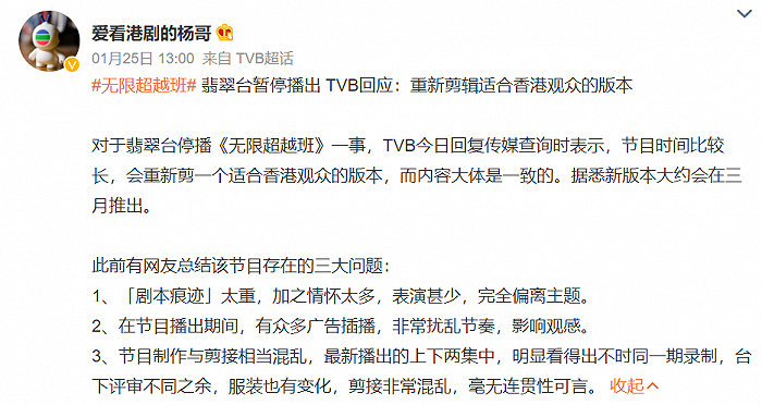 不过,“TVB+内地平台”主打情怀杀的综艺合作并非屡试不爽。由浙江卫视、优酷出品,TVB联合出品的演员专业艺训励志真人秀《无限超越班》以复刻了中国香港无线电视艺员训练班师生教学的授业形式为港剧情怀的切入点,但在豆瓣上的评分仅有3.8分,一星占比52.3%。此外,网友爆料《无限超越班》在香港本土还因民众觉得无聊而遭遇了“停播”,为此TVB重新剪辑适合香港观众的精简版本。