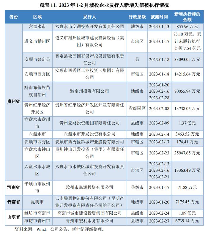 2023年1-2月,债券市场共有19家发行人被列入失信被执行人名单,其中15家为城投企业。1-2月失信被执行的城投企业发行人新增执行标的共21.36亿元,主要集中于贵州省,大多在往期已有被执行历史。除城投企业之外,2023年1-2月债券市场共有4家工商企业被列入被执行人名单,分别为江苏南通二建集团有限公司、江苏南通三建集团股份有限公司、宁夏晟晏实业集团有限公司和融创房地产集团有限公司。除已失信被执行之外,2023年1-2月共有9家城投企业披露因债务纠纷涉诉。此外,通化市丰源投资开发有限公司披露未清偿到期银行贷款5504.70万元。