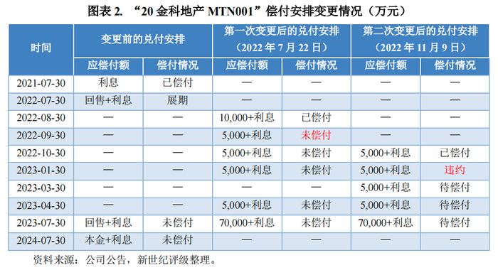 在违约前,金科股份曾分别两次对“20金科地产MTN001”和“20金科地产MTN002”展期。2022年7-8月2支中期票据分别展期,债券持有人同意取消回售并与发行人达成本息分期偿付安排。2022年10月,公司未能按期偿付“20金科地产MTN001”分期本息,但随即获得持有人会议豁免,债券达成二次展期,偿付时间顺次延后。2022年11月,“20金科地产MTN002”也达成二次展期。