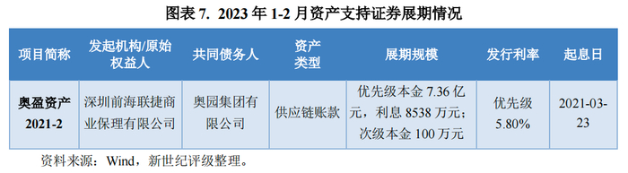 资产支持证券方面,2月24日“奥盈资产2021-2”展期,展期本金共8.22亿元(其中优先级本金7.36亿元,次级本金0.01亿元)。该支资产支持证券为供应链账款ABS,穿透信用主体为奥园集团有限公司(简称“奥园集团”)。截至2023年2月末,奥园集团累计已有6期资产支持证券展期,展期金额本息40.49亿元。