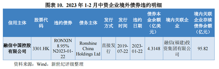 中资企业境外债方面,2023年1-2月为融信中国控股有限公司(简称“融信中国”,3301.HK)发行的“RONXIN 8.95%N2023-01-22”到期兑付违约,违约金额4.3148亿美元。此前,融信中国另外两支美元债券“RONXIN7.35% N2023-12-15”和“RONXIN8.1% N2023-06-09”于2022年7月付息违约。截至2023年2月末,融信中国的境内关联发债主体融信(福建)投资集团有限公司存续境内债券余额共95.82亿元,其中已展期金额共61.00亿元。