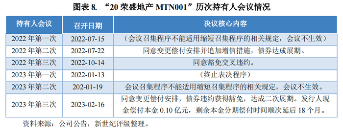 2月16日,“20荣盛地产MTN001”新一轮持有人会议通过决议,债券达成豁免并达成二次展期。荣盛发展于2023年2月23日偿付本金1000万元及相应利息,剩余本金共9.3亿元在原有偿付安排上向后顺延18个月,计划于2024年7月至2025年4月之间分期偿付。