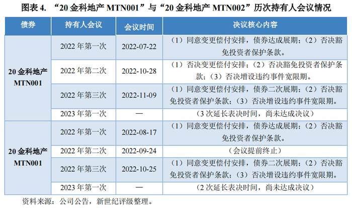 在“20金科地产MTN001”和“20金科地产MTN002”违约后,金科股份召开新一轮持有人会议,计划对违约事项进行豁免。但债券持有人经过多轮表决后并未达成豁免决议[2]。