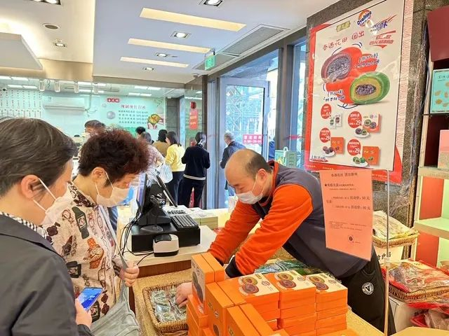 走进杏花楼福州路店一楼,一盒盒橙色包装的团子在绿色的传统青团中很是醒目。