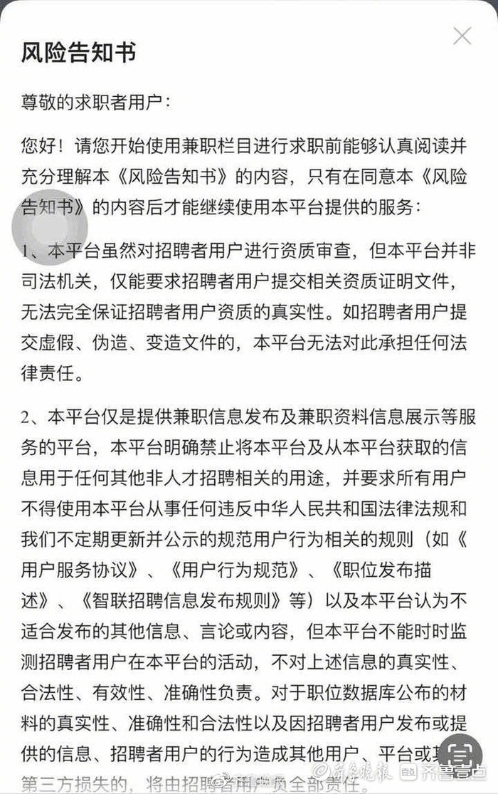 在智联招聘App中一封写给求职者的《告知书》引起了记者的注意。该《告知书》中明确写有:本平台虽然对招聘者用户进行资质审查,但本平台并非司法机关,仅能要求招聘者用户提交相关资质证明文件,无法完全保证招聘者用户资质的真实性。如招聘者用户提交虚假、伪造、变造文件的,本平台无法对此承担任何法律责任。