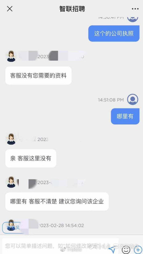 “客服告诉我,没有我所需要的资料,营业执照哪里有,他们不清楚,建议让我询问涉事企业。”小张表示,被骗后,当初那家公司已经从智联招聘平台消失,该公司相关工作人员也联系不上,因此她根本无法联系到该公司。