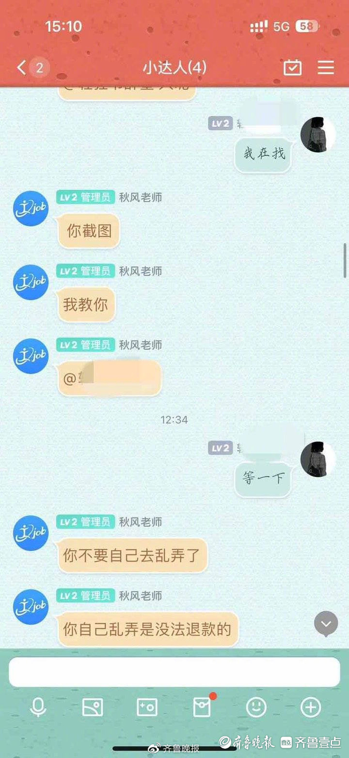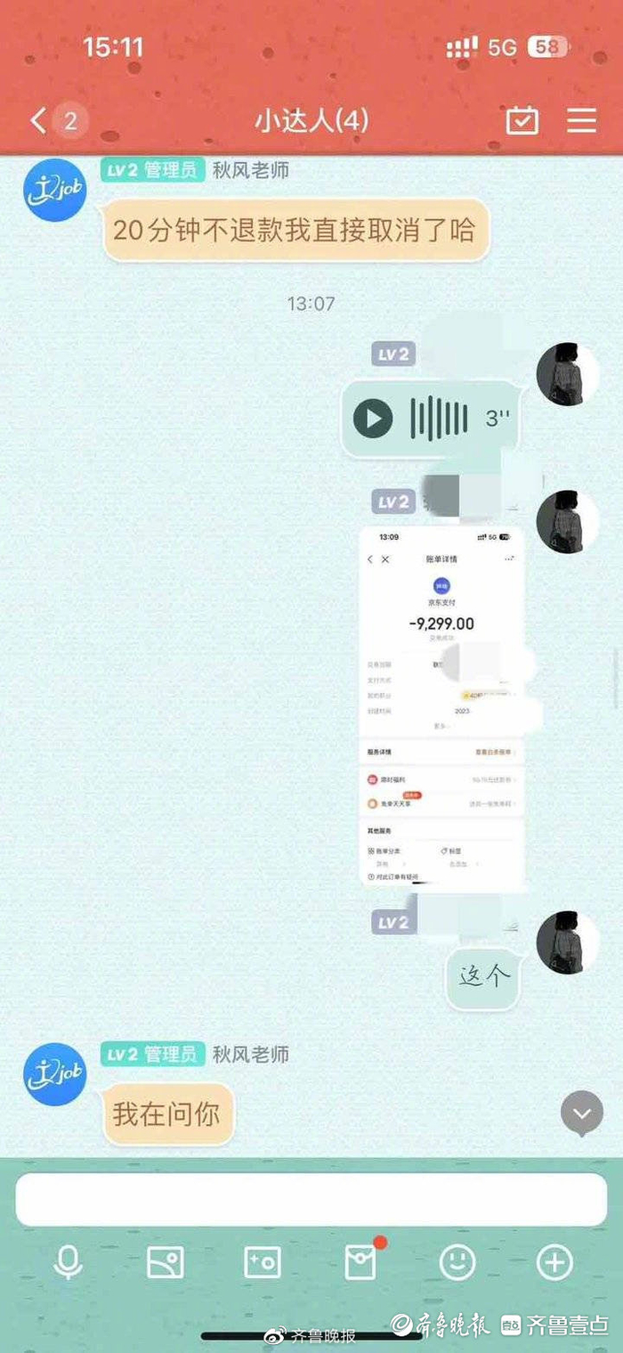 “当时我问过对方为什么会是付款页面,对方答复不让我付款,让我先升级一下京东白条,我一点升级按钮,结果9000余元就直接支付出去了。”小张称,在发现被扣款后,她立即在群内进行了反映,对方又手把手指导她如何进行退款。然而,一套操作下来,不仅钱没有退还,对方还把她踢出了群。