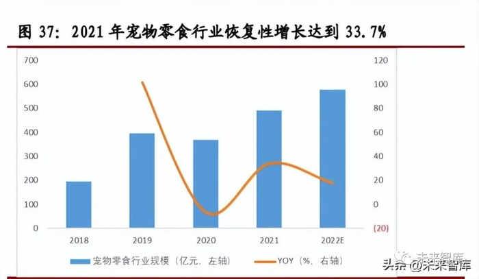 千亿级宠物食品行业,保持高增长。伴随我国养宠规模的持续扩大,宠物食品行 业也获得持续增长,2021 年,行业规模达到 1,486 亿元,同比高增 18.91%。2016-2021 年,行业 CAGR 为 26.60%,艾瑞咨询预计 2022 年行业规模将突破 1,700 亿元,达到 1,732 亿元。2020 年,因疫情因素影响,宠物主降低非刚需产 品宠物零食购买,但 2021 年实现恢复性增长,零食行业规模达到 492 亿元,同 比增长 33.70%,预计 2022 年将超过 500 亿元规模。