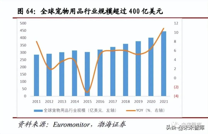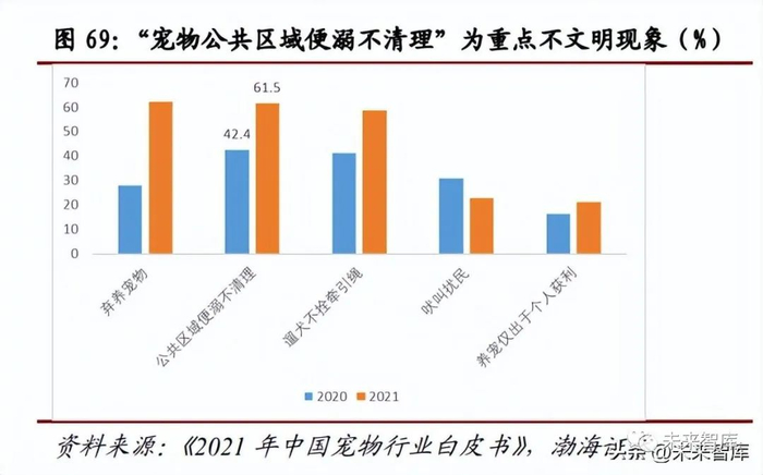 提升文明养宠,卫生用品规模得以壮大。“宠物公共区域便溺不清理”,为公众对 养宠对公共环境影响的重点敏感问题之一。2021 年,61.5%的人群认为“宠物公 共区域便溺不清理”属于典型的不文明养宠行为,紧随占比 62.2%的“弃养”行 为之后,较 2020 年提高 19.3pct.。我们认为,诸如宠物尿垫、尿裤、拾便袋等家用与户外用一次性宠物卫生用品,能够有效解决宠物便溺对公众环境的影响。近年,伴随公众与宠物主对文明养宠重视程度的日益提升,促使国内宠物卫生用 品行业规模稳步扩张,2021 年达到 218.6 亿元,同比增长 21.65%。