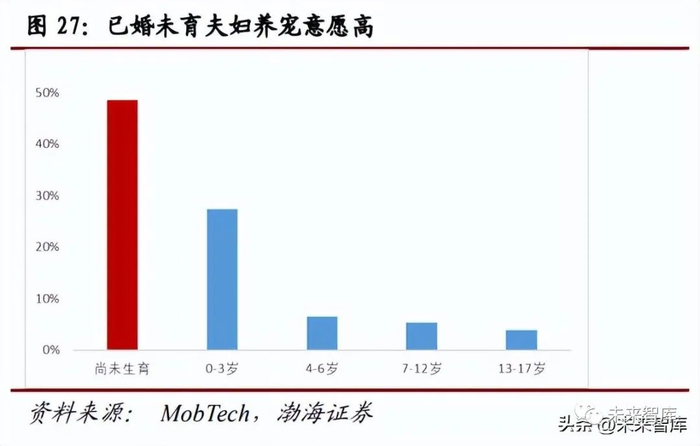 “生娃”与“养宠”并不矛盾。从已婚宠物主生育情况来看,48.6%的人处于尚 未生育的状态。而 2022 年,我国新出生人口数跌破千万,为 956 万人,同比下 降 9.98%。我们认为,在已婚夫妇生育意愿未明显提升,以及新出生人口数未现 拐点之前,宠物仍将在已婚未育和丁克家庭中扮演重要的陪伴角色。另一方面, 我们也认为,即便是在出生人口恢复增长的情况之下,“生娃”与“养宠”也并不 矛盾,饲养宠物能够很好的培养孩子的责任心与爱心,并且也能成为孩子感知和 认知世界的一种方式。此外,例如饲养陪伴犬或护卫犬作为宠物,在特定情况之 下,还能保障孩子的安全。