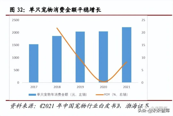 “宠物家人”强化宠物主消费粘性,拔高消费水平。2017-2021 年,国内单只宠 物年均消费金额实现平稳增长,至 2021 年为 2,216.3 元,同比增长 8.23%。从 前文中的数据来看,为爱养宠是消费者成为宠物主的主因,而宠物也在宠物主的 日常生活中,满足了陪伴、压力缓解、培养责任心等诉求。在此过程中,宠物角 色认知也在不断提升,角色拟人化带动了宠物家庭地位的提升。2021 年,85.1%的宠物主将宠物视为家人,8.5%的宠物主将宠物视为朋友。我们认为,宠物角色 的变化与持续升级,强化了宠物主在宠物领域的消费粘性,为提升宠物健康和生 活品质,带动了单宠消费金额的稳步提升。同时,宠物主针对宠物消费需求的变 化,也催生了诸如宠物写真、宠物社交、宠物生日、宠物年夜饭等新消费场景, 进一步夯实消费金额增长基础。
