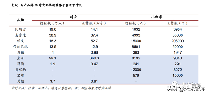 社交媒体具有极好的消费者触达能力,国牌宠物食品发力新媒体品牌建设。目前, 电商平台和短视频平台为消费者获取宠物食品相关资讯的主要渠道,艾媒咨询数 据显示,2021 年两大渠道占比分别为 63.2%和 56.7%,社交媒体和广告在消费 者心智影响与信息触达等方面具有良好效果。伴随近年抖音、小红书等短视频平 台以及生活方式类社交媒体的兴起,国牌宠物食品获得了全新的品牌建设渠道。我们统计了部分国内外头部宠物食品品牌,抖音与小红书官方账号运营情况。从 数据上看,国产品牌整体在粉丝数量以及作品获赞的情况上,显著好于外资品牌。我们认为,本土品牌对于中国文化和消费者心智洞察更具优势,在新媒体品牌建 设和运营层面,国牌较外资品牌更具优势。而在消费者对于国产品牌已具有较好 认知的情况之下,全新的品牌建设与宣传途径,将有助于未来进一步提升国牌市 场占有率。同时,品牌代言、综艺赞助、联名游戏等泛娱乐化营销方式,也成为 了品牌宣传的重要途径。
