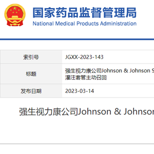 眼力健(上海)医疗器械贸易有限公司报告,由于涉及特定型号、特定批次产品过期,生产商强生视力康公司Johnson & Johnson Surgical Vision, Inc.对其生产的一次性LAMINAR层流超乳探针和灌注套管(国械注进20173166671,国械注进20193160370)主动召回。召回级别为二级召回。涉及产品的型号、规格及批次等详细信息见《医疗器械召回事件报告表》。