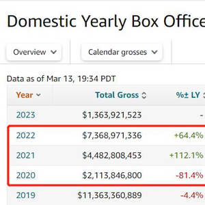 受新冠疫情冲击,北美电影市场近几年并不好过。2020年和2021年全年票房皆无法突破50亿美元,创下21世纪北美年度票房的历史新低记录,全球第一大电影市场的宝座被拱手让给中国内地。